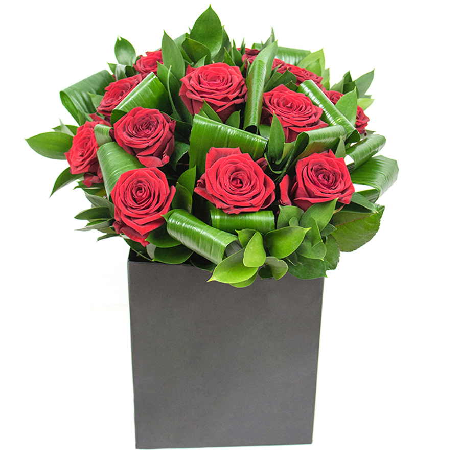 Experience glamour and elegance with our meticulously handcrafted bouquet featuring radiant red roses, complemented by the grace of aspidistra leaves and subtle ruscus. Every bloom is carefully hand-selected to ensure maximum freshness and exquisite beauty, resulting in an arrangement that is both luxurious and inviting.